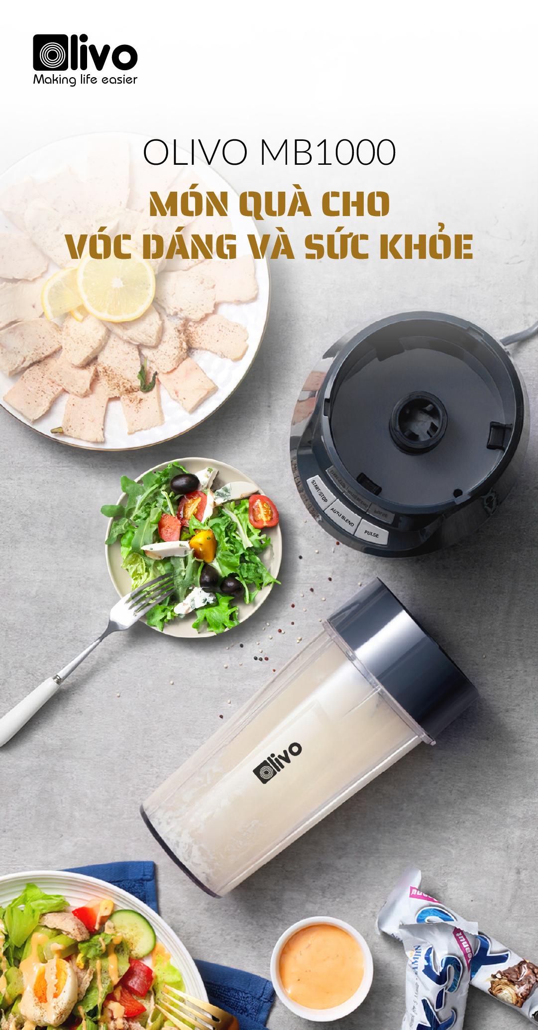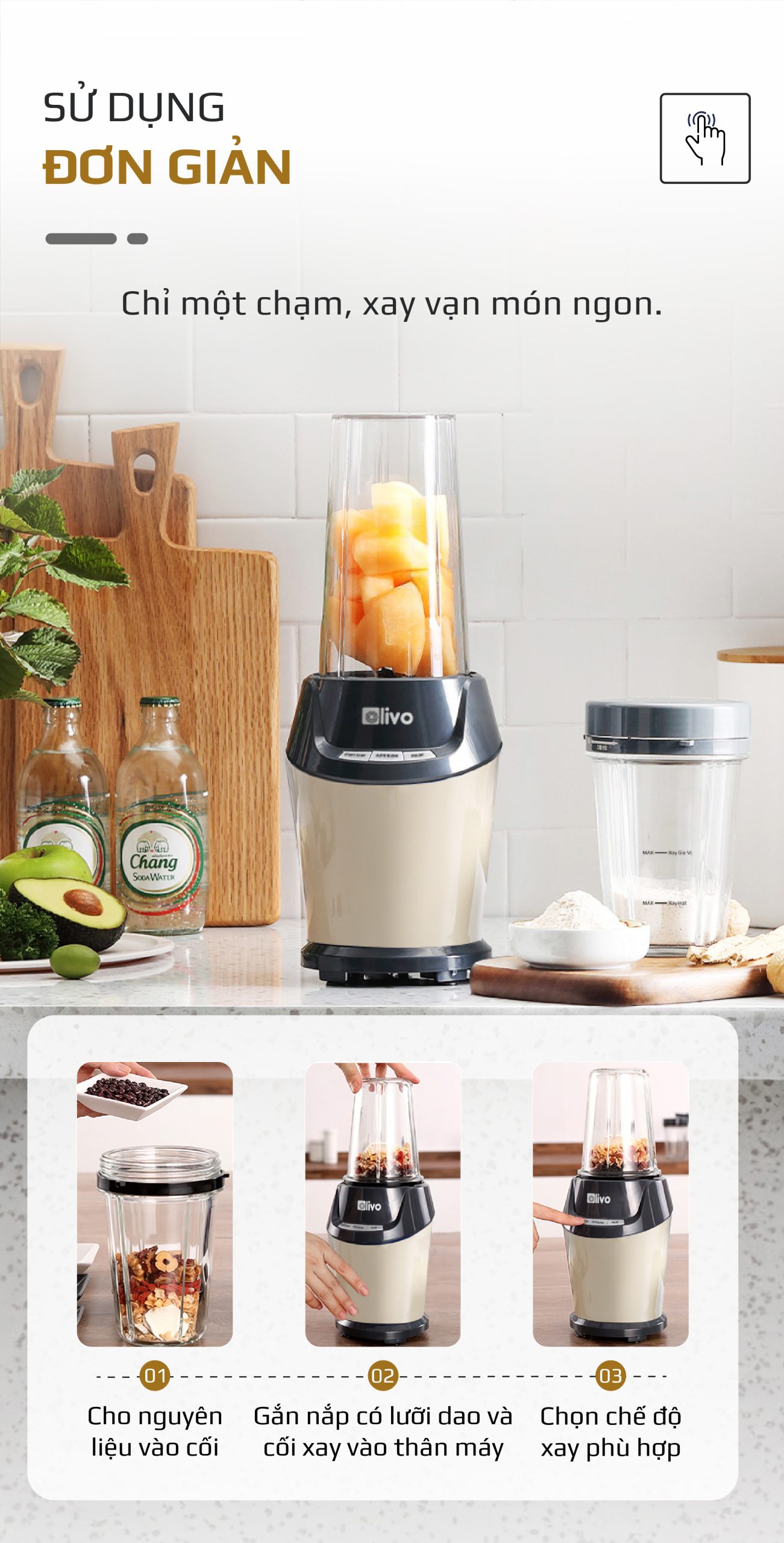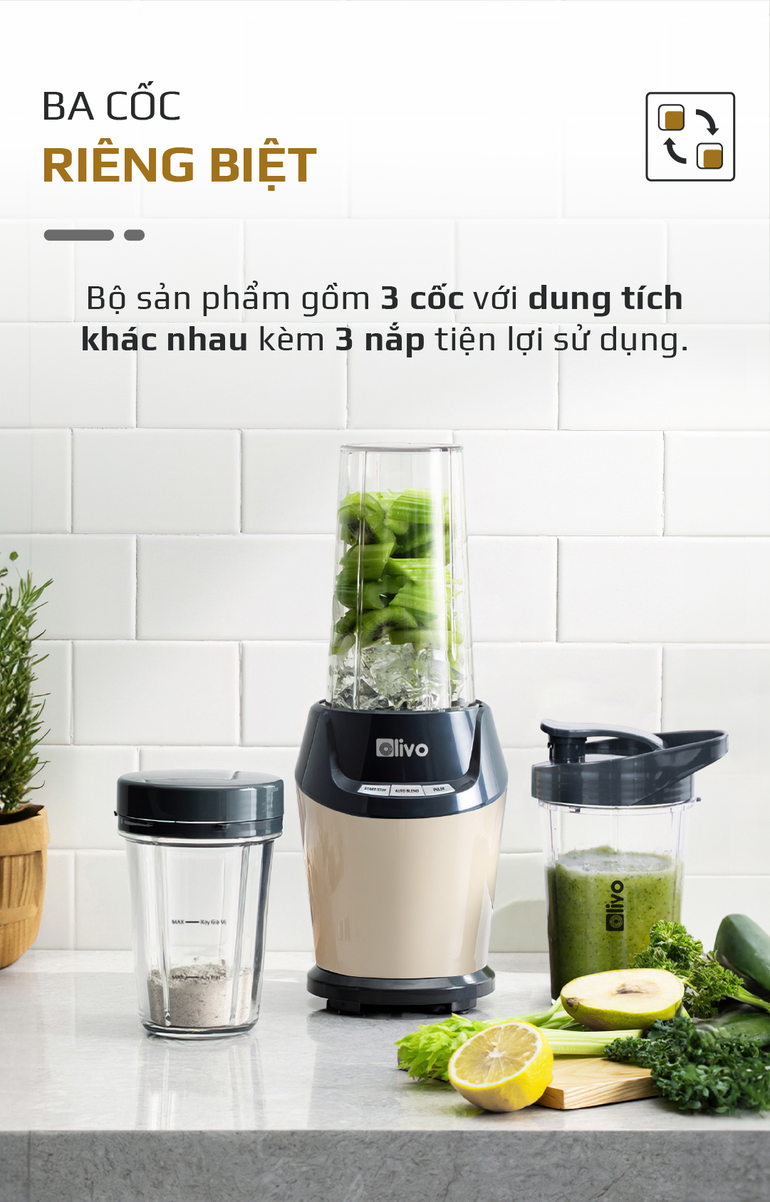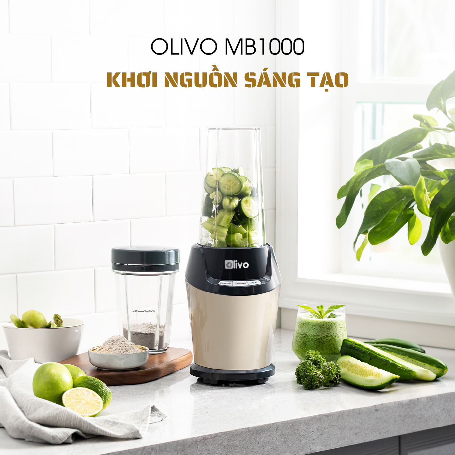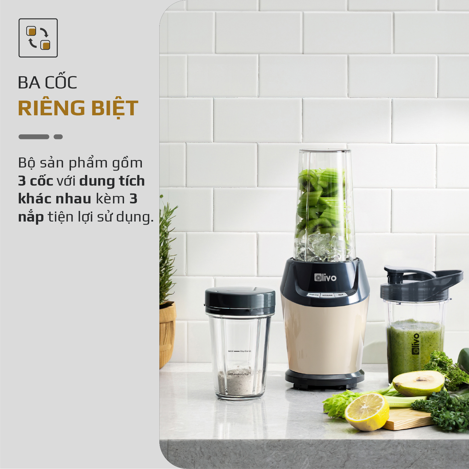 Máy Xay Sinh Tố OLIVO MB1000 – Ba Cốc Xay Linh Hoạt – Xay Đá Bào, Xay Sinh Tố, Smoothie, Đồ Ăn Dặm Cho Bé, Xay Đồ Khô – Công Suất Lớn 1000W
