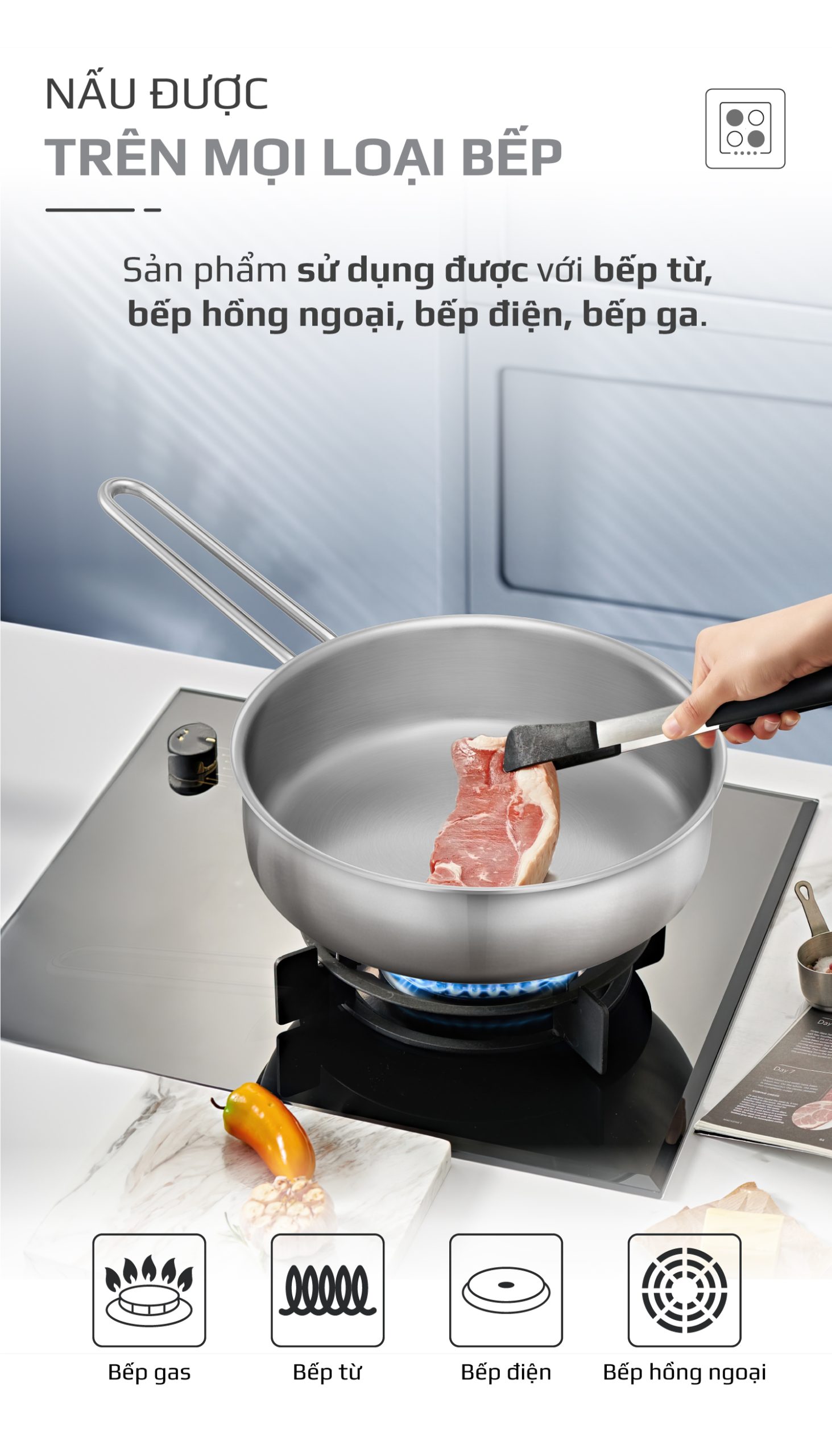 Điểm quan trọng nữa của một chiếc chảo đa năng đó là khả năng sử dụng linh hoạt với nhiều thiết bị nhà bếp.