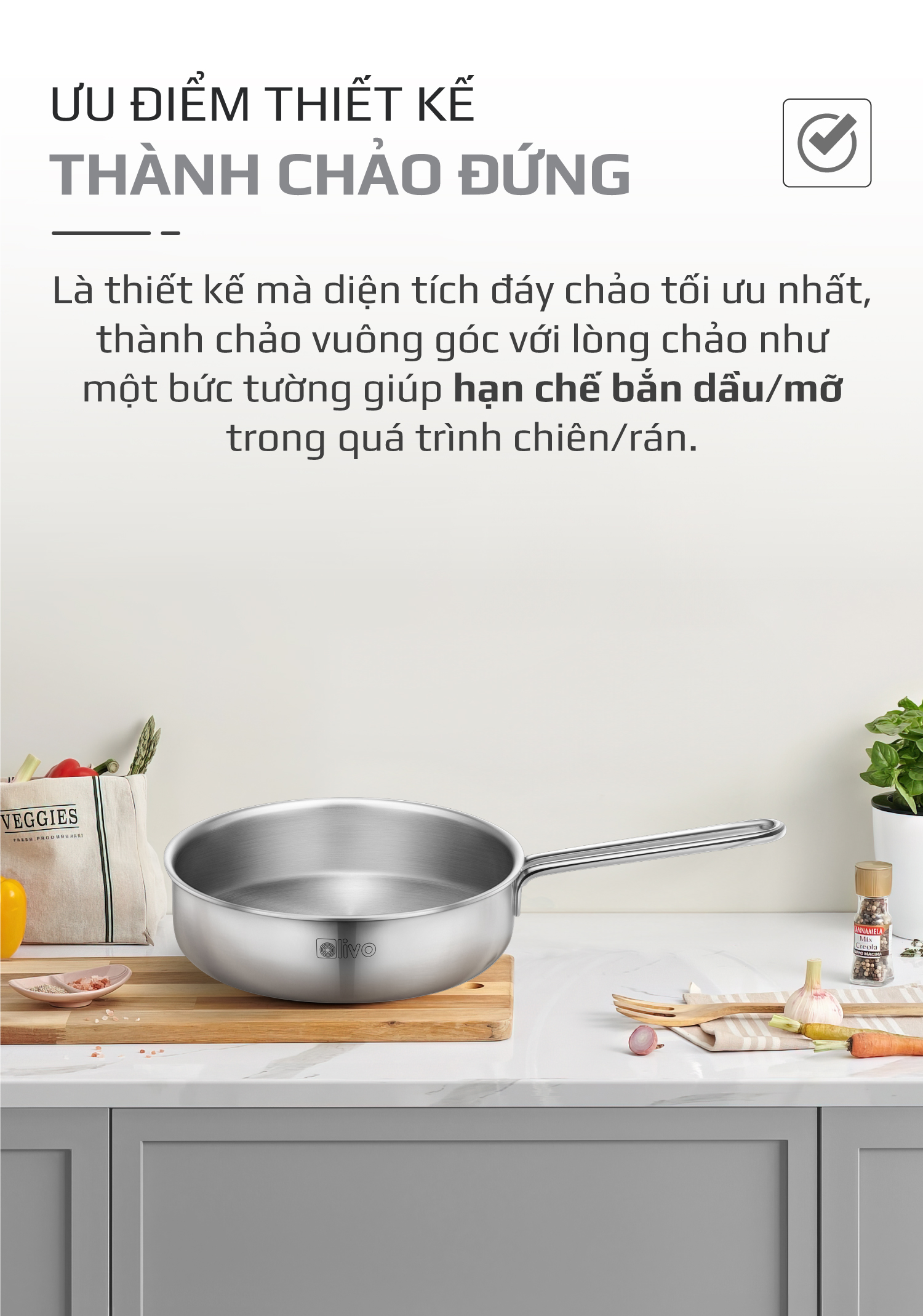 Thiết kế thành chảo thẳng đứng: Giúp hạn chế dầu bắn ra ngoài trong quá trình nấu nướng, đặc biệt là khi chiên, xào ở nhiệt độ cao.