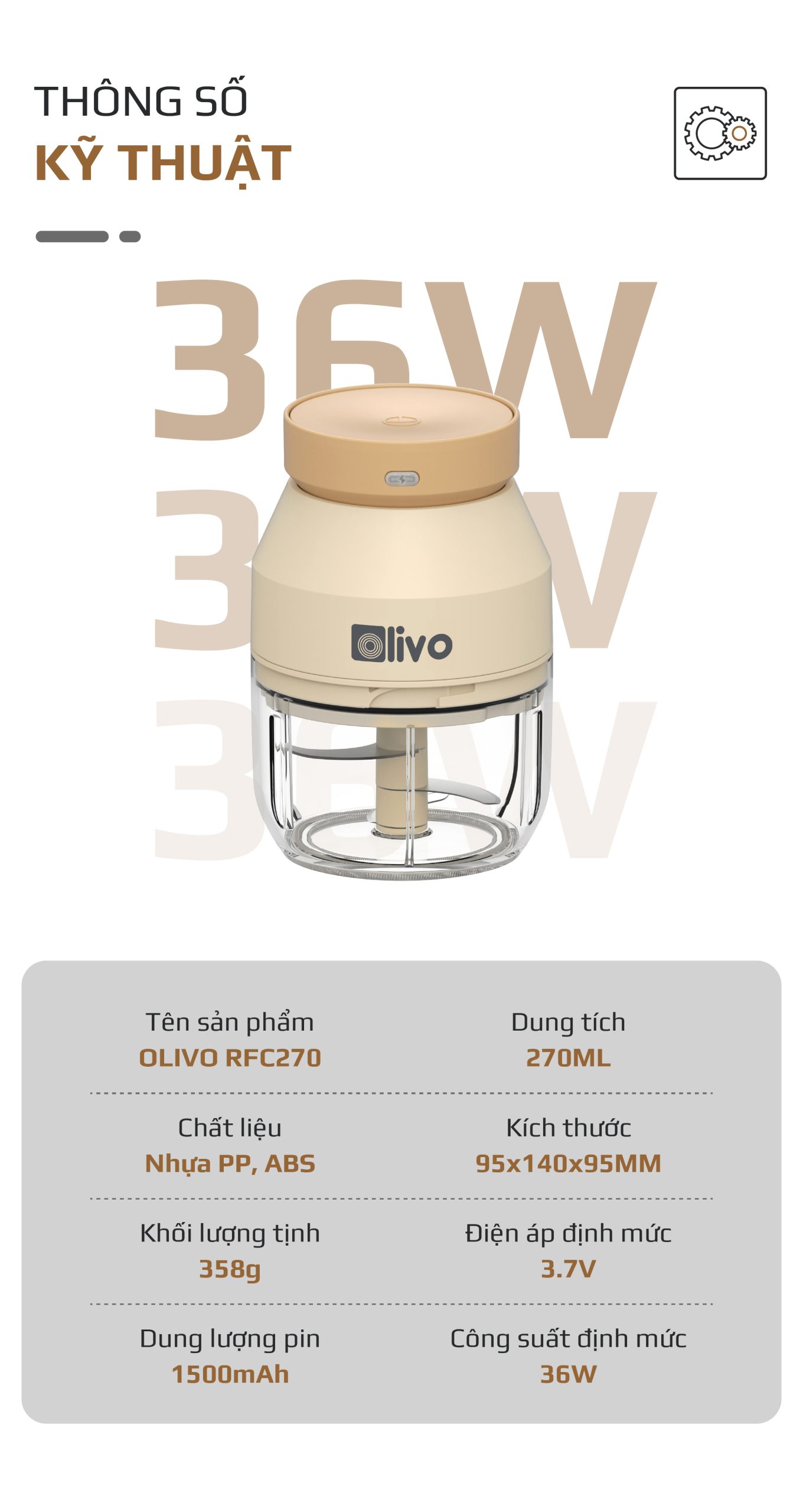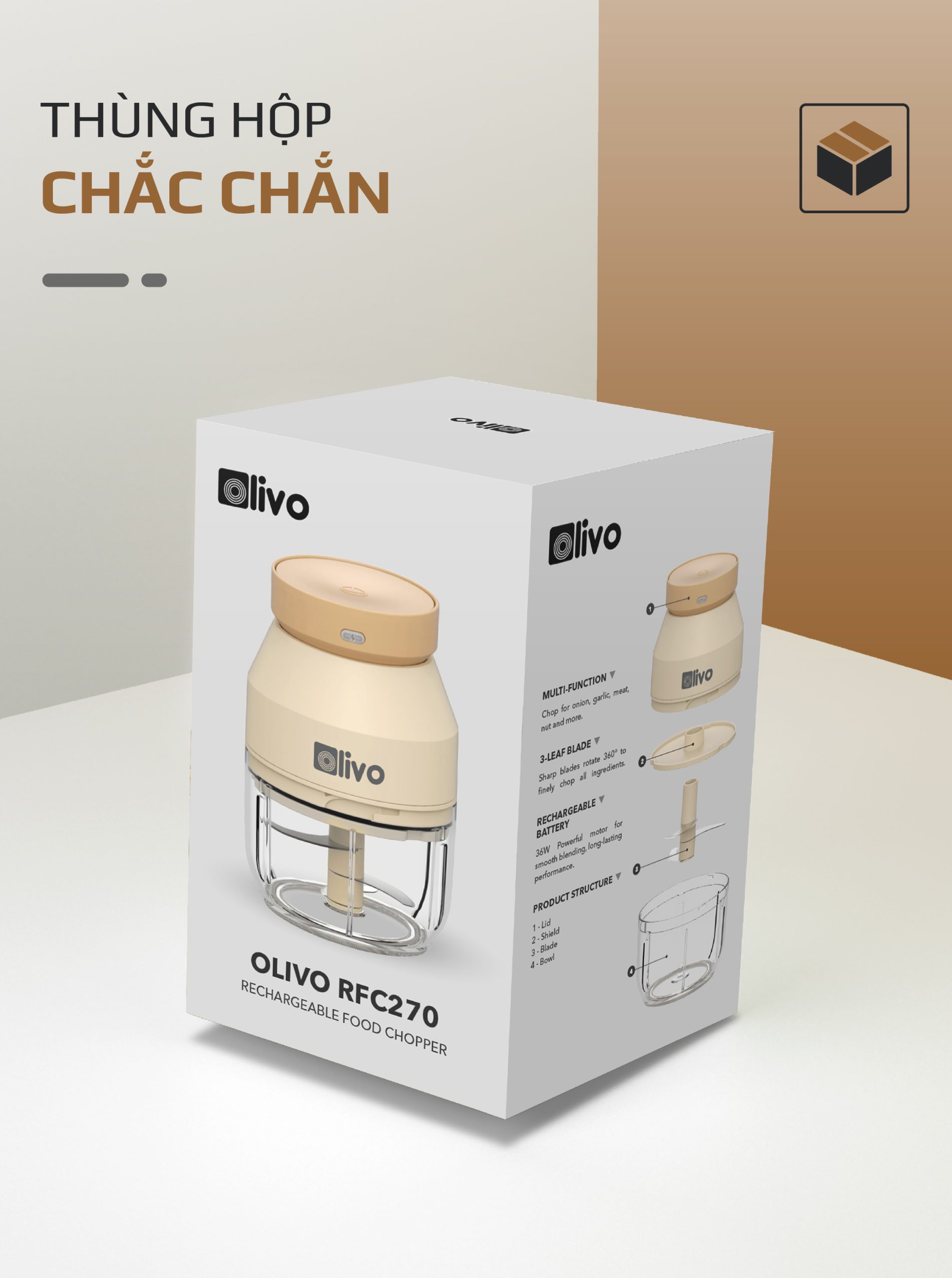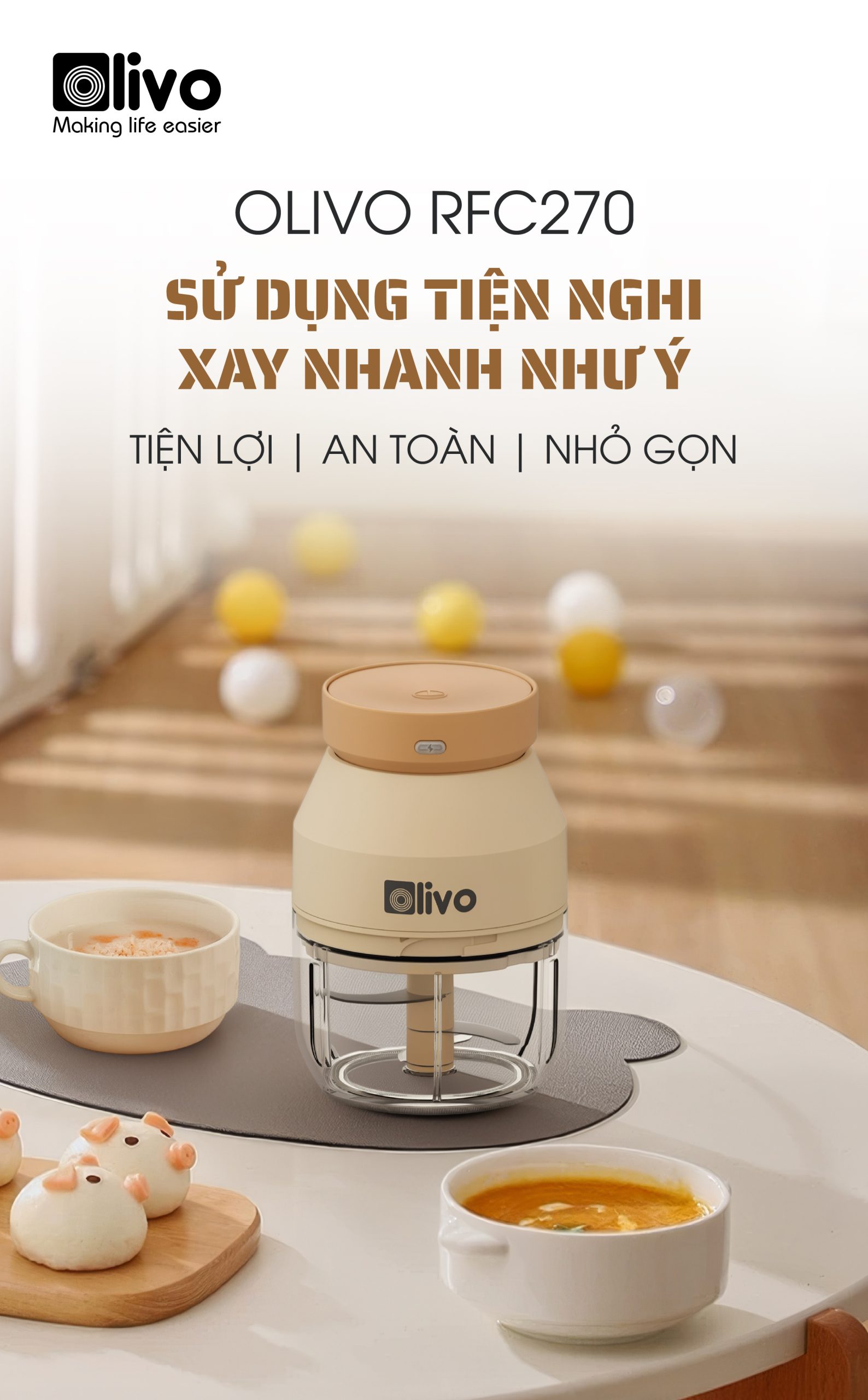 - Trong những ngày bận rộn, việc nấu nướng trở nên dễ dàng và nhanh chóng hơn nhờ Máy xay thực phẩm đa năng sạc pin OLIVO RFC270. Có thiết kế nhỏ gọn, tiện dụng trong việc xay những thực phẩm nhỏ, được các chị em phụ nữ yêu thích vì là trợ thủ lý tưởng cho gian bếp hiện đại.