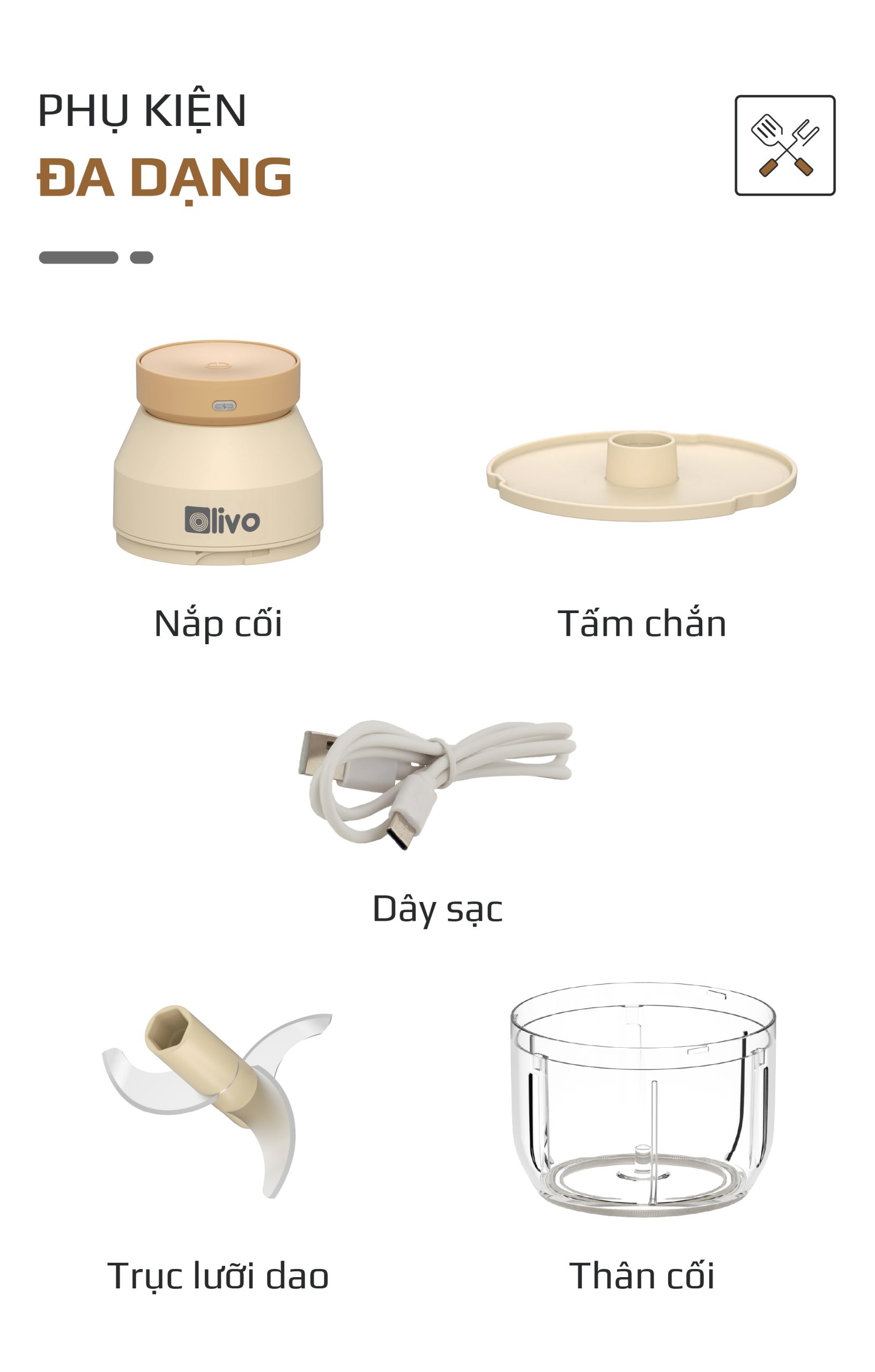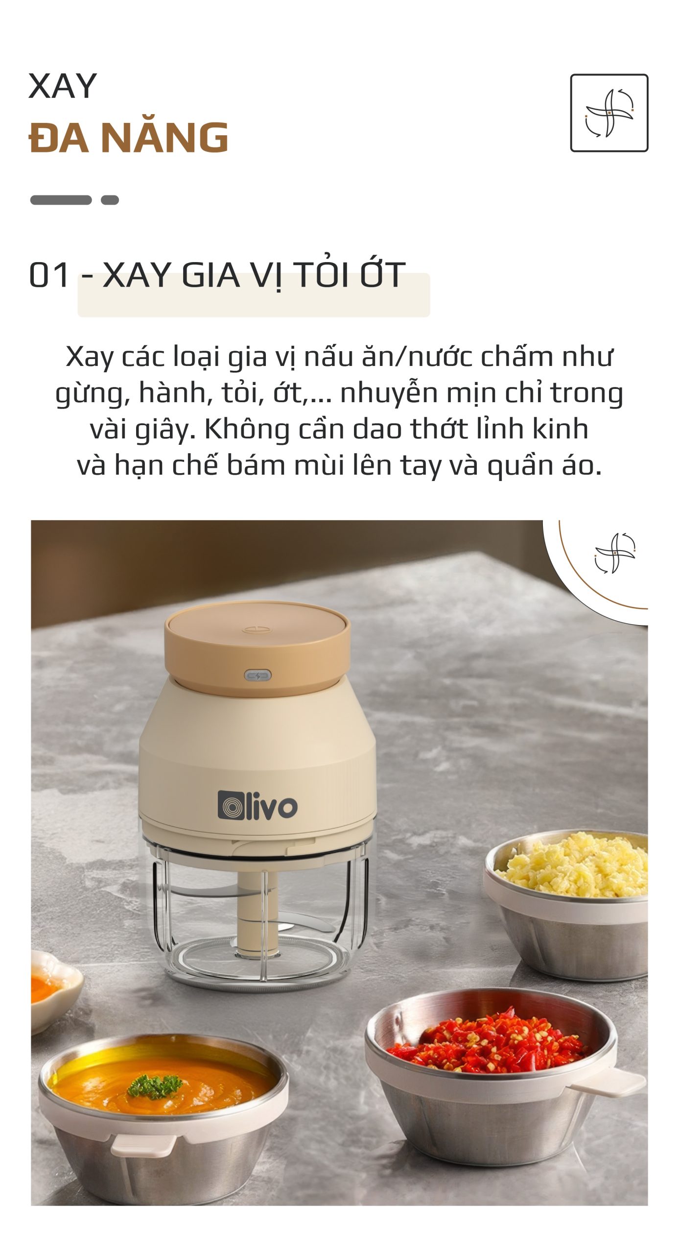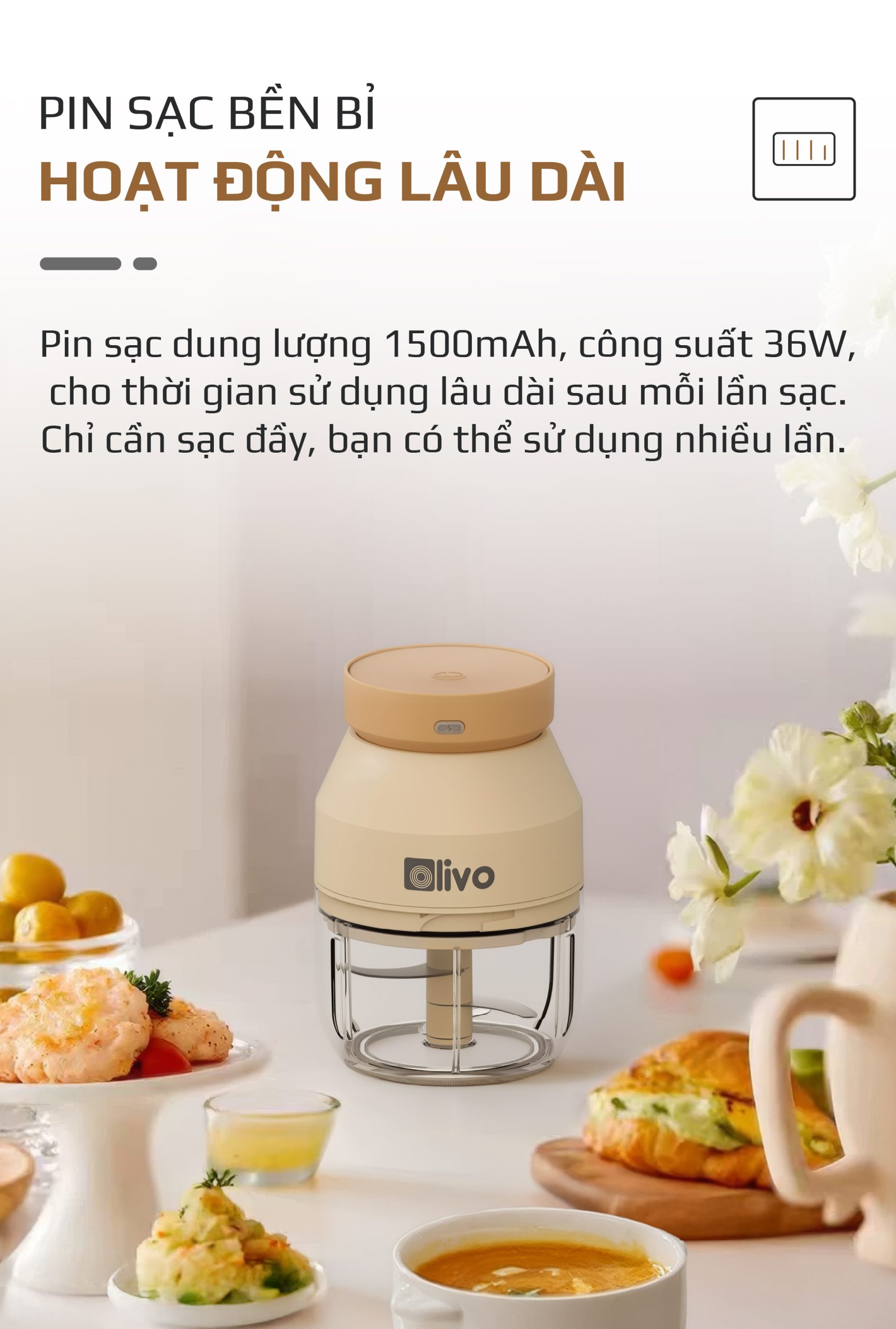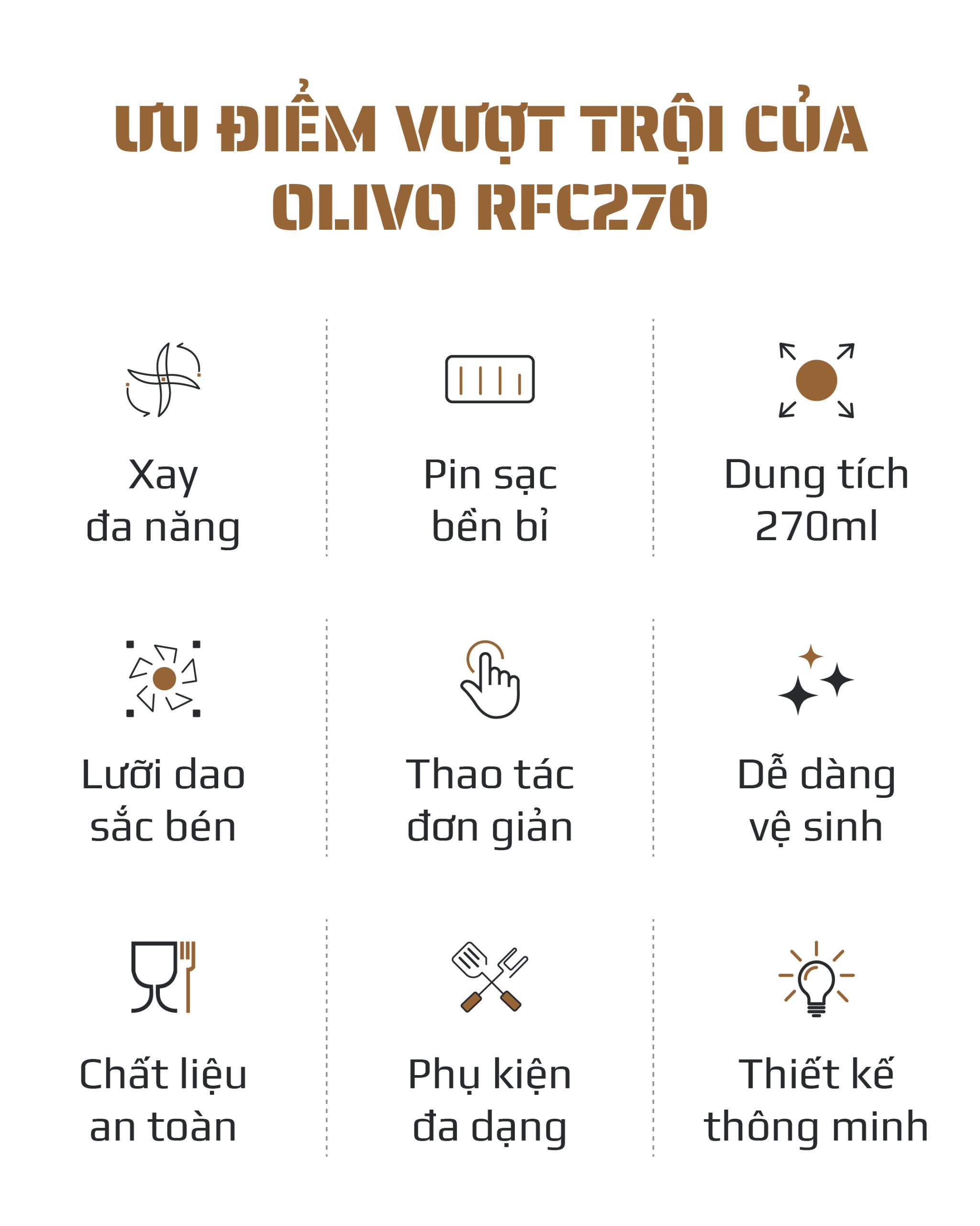- Trong những ngày bận rộn, việc nấu nướng trở nên dễ dàng và nhanh chóng hơn nhờ Máy xay thực phẩm đa năng sạc pin OLIVO RFC270. Có thiết kế nhỏ gọn, tiện dụng trong việc xay những thực phẩm nhỏ, được các chị em phụ nữ yêu thích vì là trợ thủ lý tưởng cho gian bếp hiện đại.