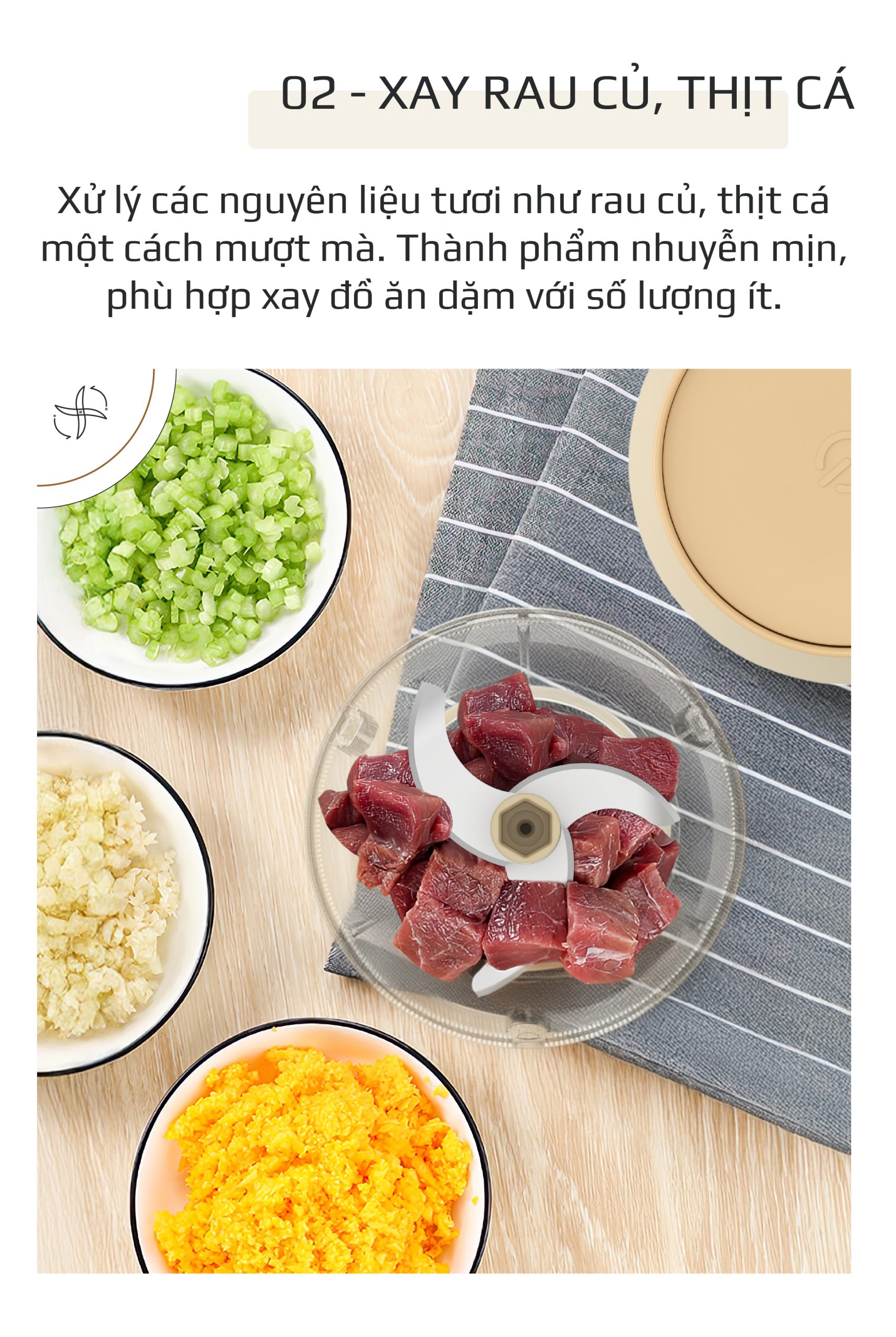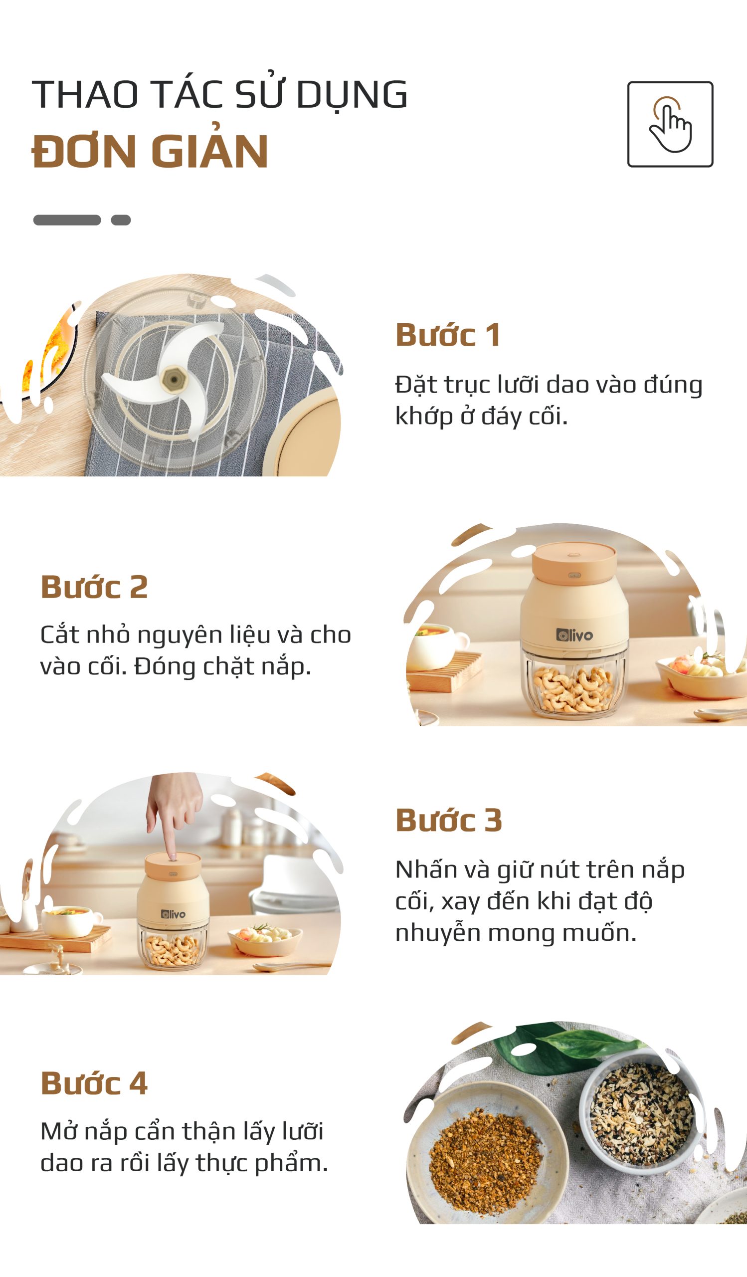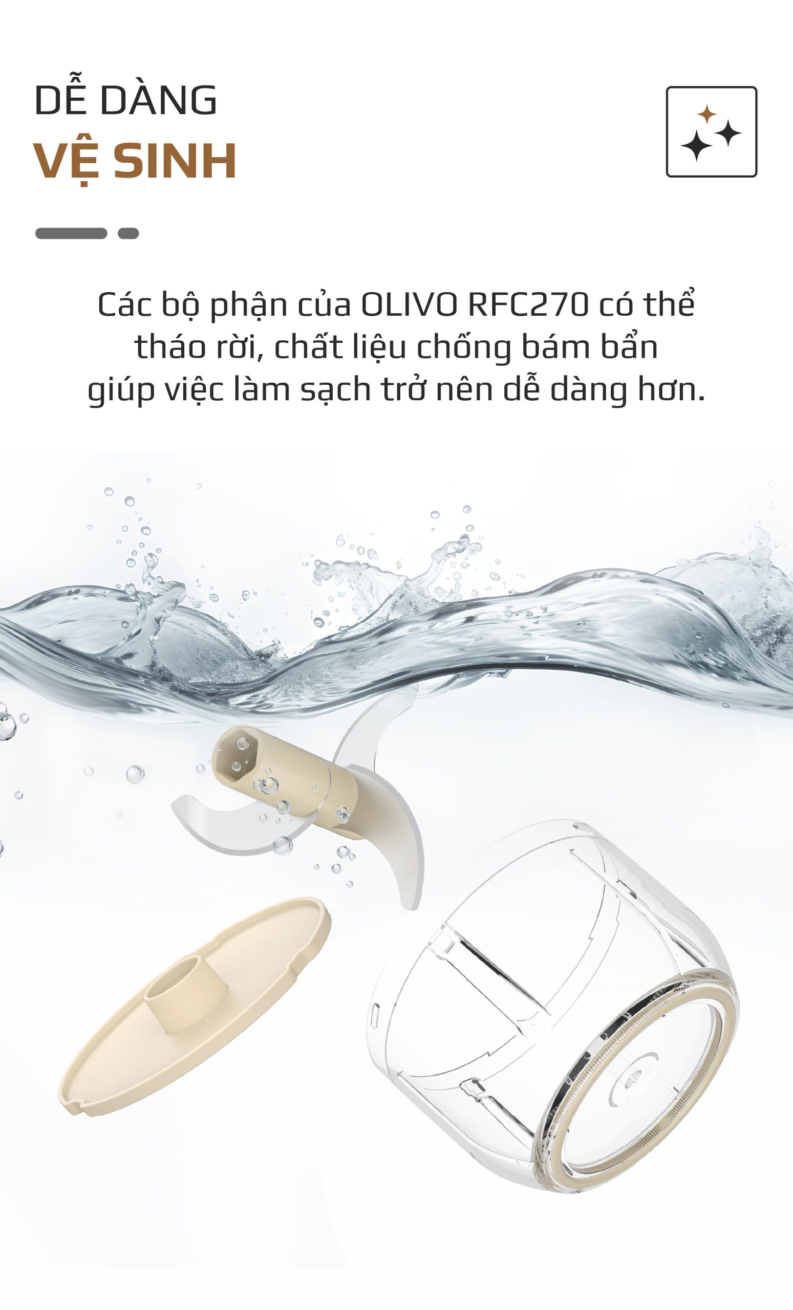 - Từ những gia vị như gừng, hành, tỏi, ớt… hạt khô như hạt điều, đậu phộng, hạnh nhân… đến thực phẩm như thịt, cá hay rau củ, OLIVO RFC270 đều dễ dàng xử lý trong vài giây. Đặc biệt, sản phẩm còn hỗ trợ đắc lực cho các mẹ bỉm trong việc chế biến đồ ăn dặm cho các bé mới tập ăn.
