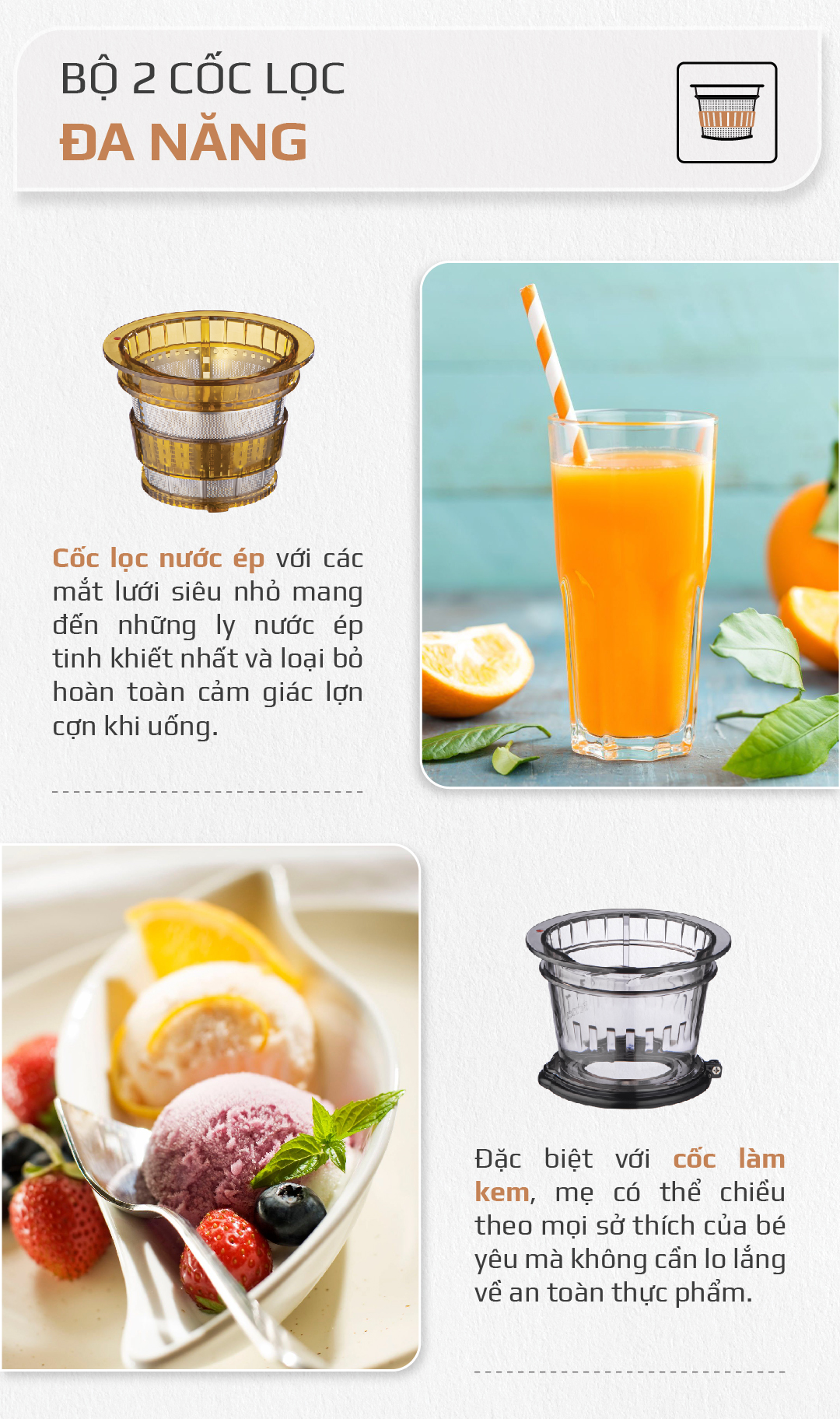 3 chế độ lọc riêng biệt: Cốc lọc nước ép, cốc làm sinh tố, cốc làm kem cho phép người dùng linh hoạt thay đổi chế độ lọc phù hợp nhất với nhu cầu sử dụng. Bạn có thể thoải mái sáng tạo những thức uống, đồ ăn ngon lành, tươi mát từ rau củ, hoa quả trong tích tắc mà không lo bị nhàm chán.