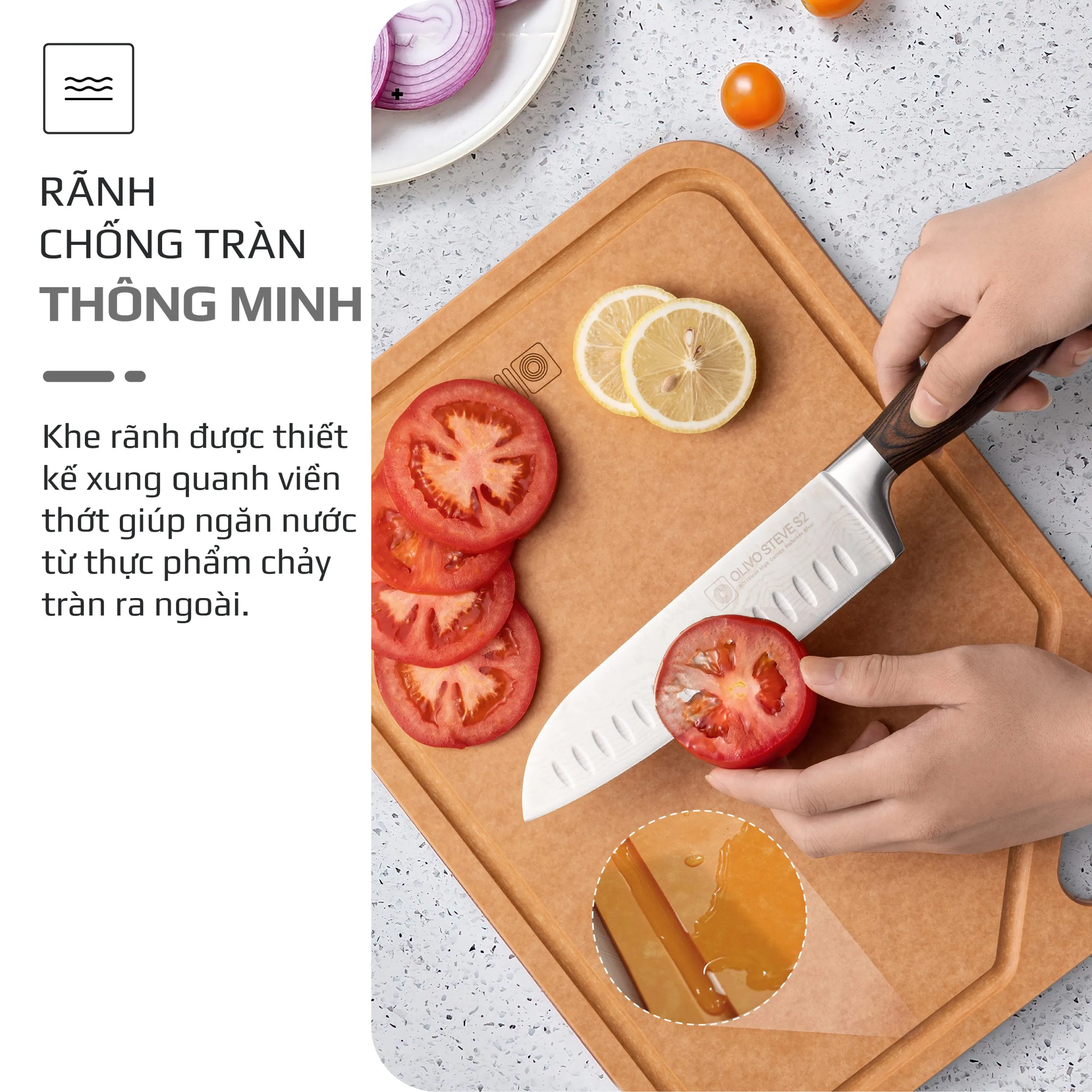 - Rãnh chống tràn thông minh xung quanh viền thớt đảm bảo nước từ thực phẩm không chảy tràn ra mặt bếp. Có móc treo thớt tiện lợi giúp dễ dàng sử dụng và bảo quản thớt luôn khô ráo, sạch sẽ.