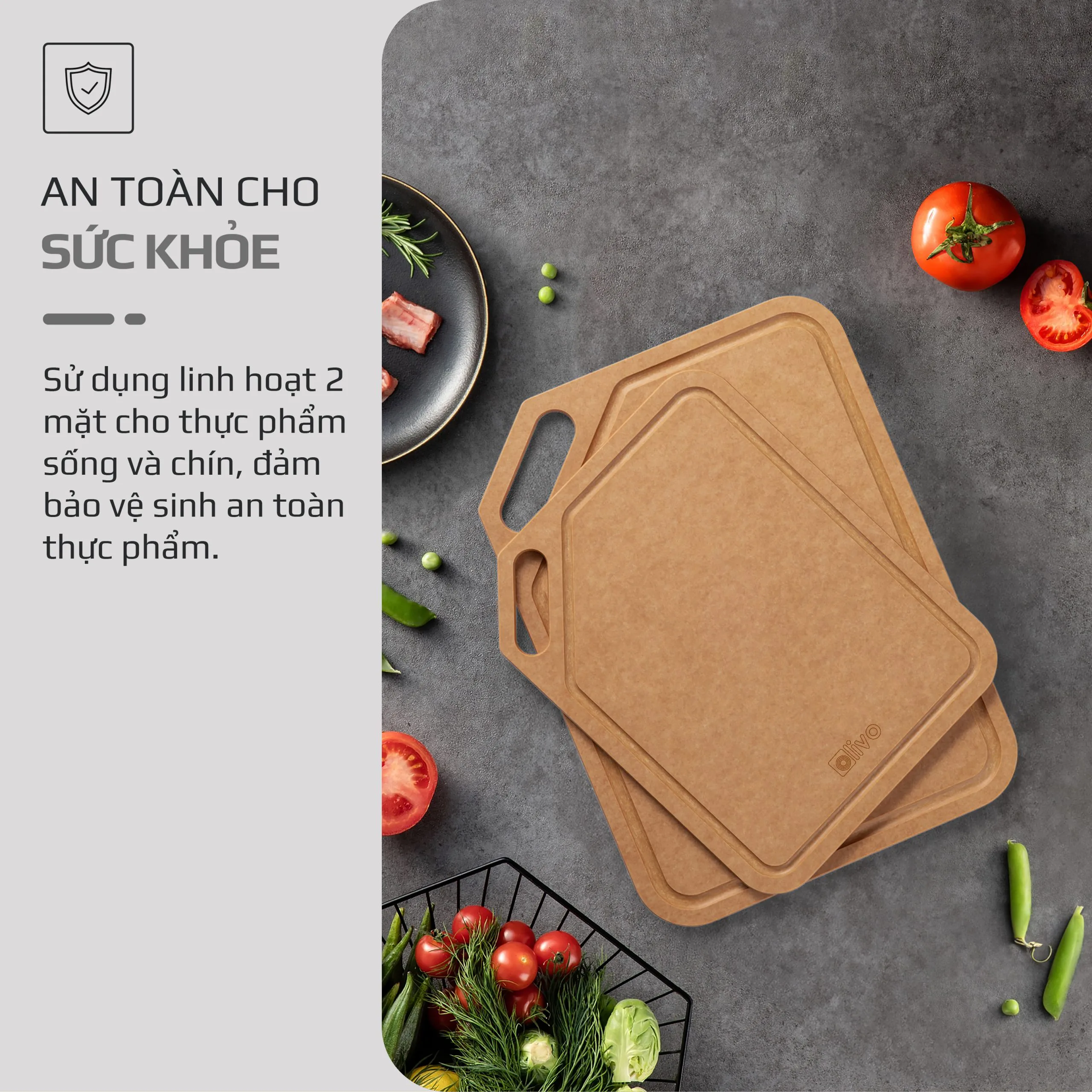 - Thớt là vật dụng thiết yếu trong căn bếp. Thớt OLIVO Wood Fiber K30 và K37 là phân khúc sản phẩm cao cấp thân thiện với môi trường, sức khỏe của người sử dụng. Đặc biệt, chất liệu “wood fiber” – sợi gỗ tự nhiên đáp ứng mọi tiêu chuẩn an toàn có thể kể đến như: thớt không bị mùi hôi, ẩm mốc, cong vênh, mùn thớt, có độ bền cao, hạn chế vết dao cắt… Vì vậy, thớt OLIVO Wood Fiber xứng đáng góp mặt trong căn bếp nhà bạn để trở thành trợ thủ đắc lực cho người nội trợ khi sơ chế thực phẩm.