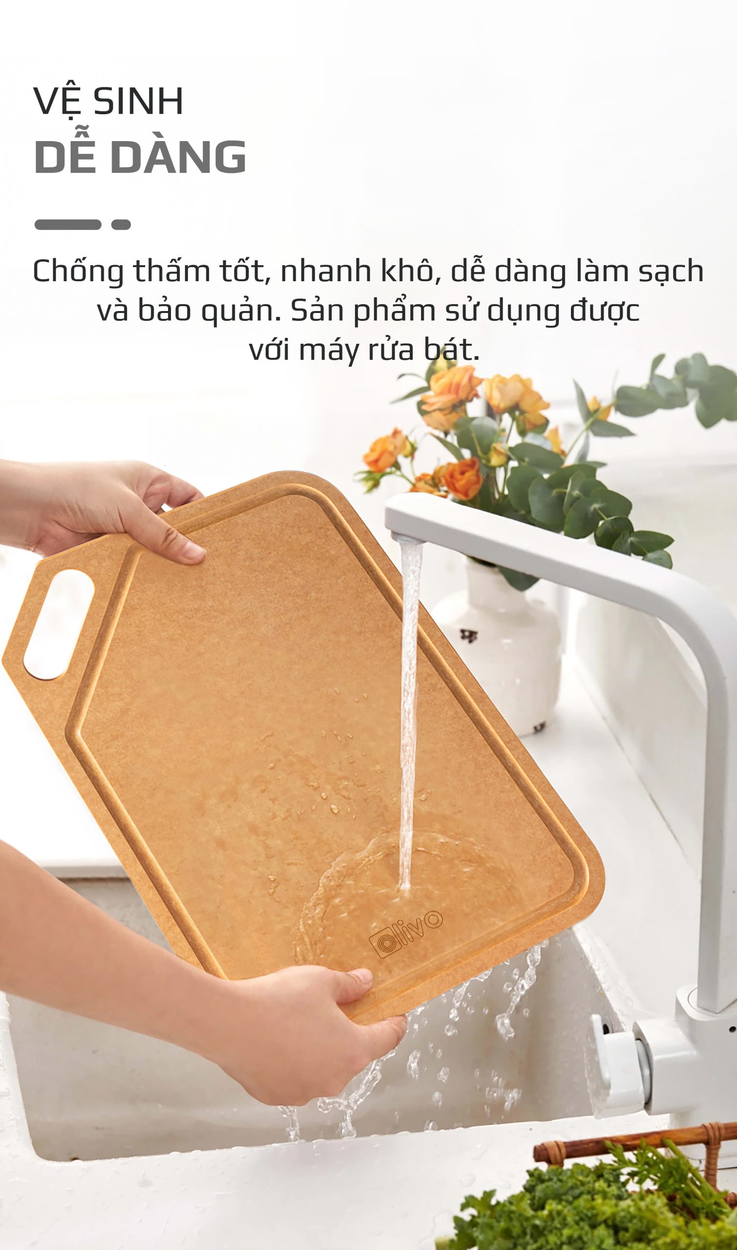 - Sản phẩm an toàn với thực phẩm nóng, có thể sử dụng trực tiếp đồ ăn trên thớt. Thớt được làm từ vật liệu sợi gỗ cao cấp đảm bảo không cong vênh, ẩm mốc, không bị mùn thớt và không có mùi hôi.
